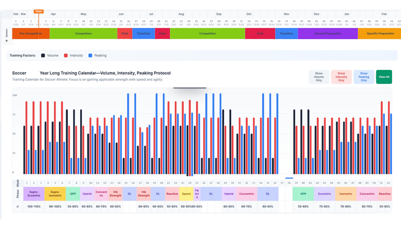 Below is an example of how you can schedule your athletes' year-round training calendar. This shows what times of the year the athlete wants to peak, this means volume is low and intensity is high. We can use this information to better assess training frequency, intensities and volume.