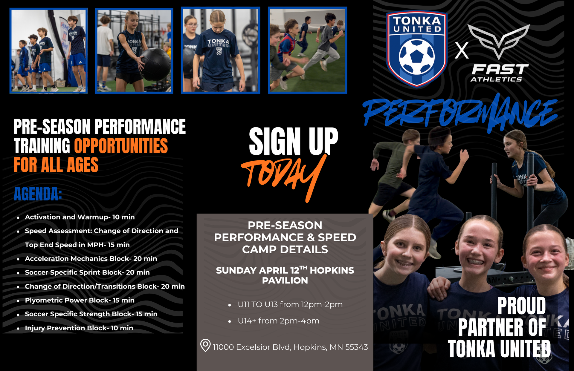 Tonka United's partnership with FAST Athletics will bring new sports performance camps and programming to all players all year long. All Tonka United players, and our community can GET FAST through various camps hosted at Tonka United facilities, as well as an exclusive discounts on all FAST Athletics performance programs by registering through our Tonka United x FAST landing page.