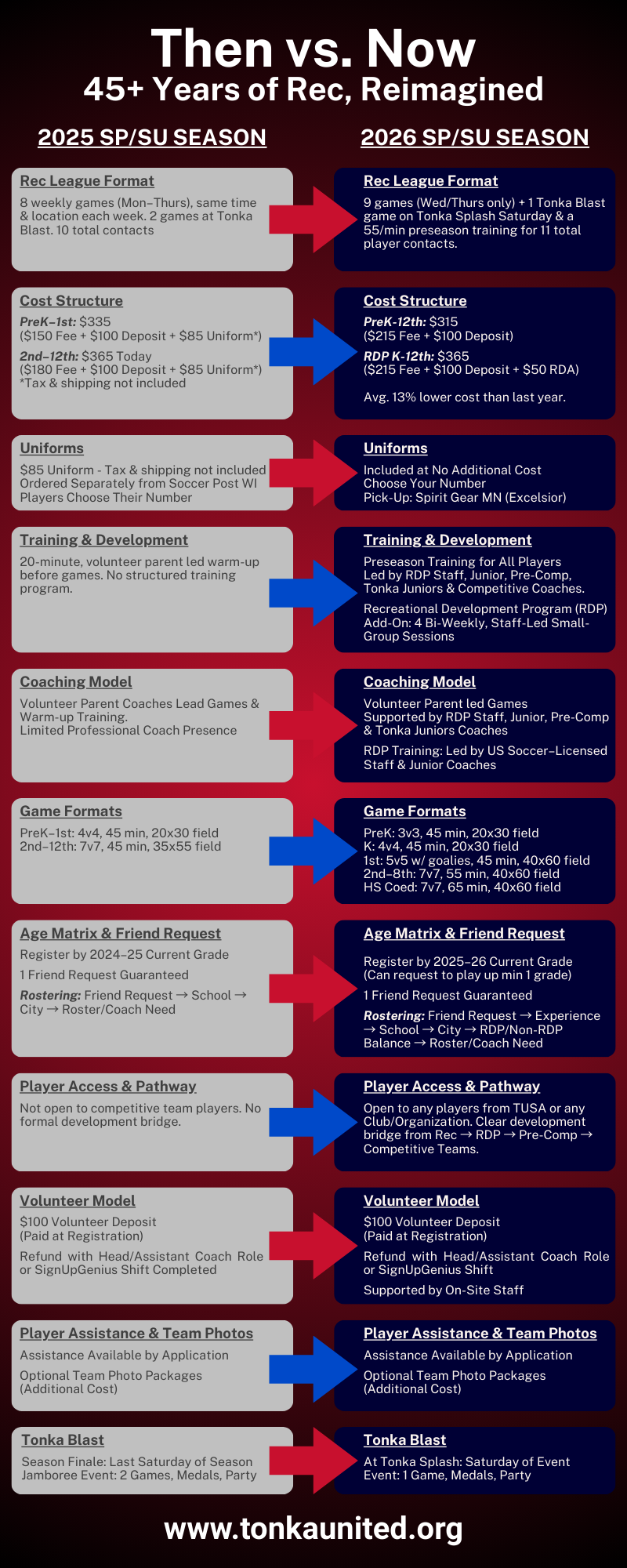 For just $50 more than Rec League, the Tonka United Recreational Development Program (RDP) adds 4 US Soccer license Staff Coach led training sessions to your player’s season, bi-weekly, delivering more touches on the ball, structured development, and a clear pathway toward Pre-Comp and Competitive Team opportunities, all while staying on the same team with friends. Learn more and explore RDP on our RDP webpage.
